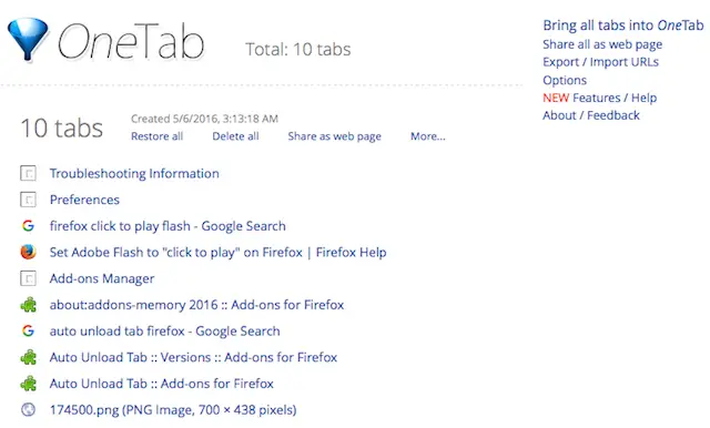 OneTab est une autre extension qui vous permet de gérer les onglets de notre navigateur. Il nous permet de fermer ou de rouvrir tous les onglets de notre navigateur d’un seul coup ou de sauvegarder la liste des sites ouverts pour y accéder plus tard, un bon moyen d’avoir accès à cette page sans qu’elle soit ouverte dans le navigateur et consommatrice de ressources.