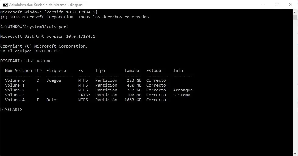 Une fois que nous avons localisé le volume et la lettre, nous exécuterons la commande « select volume n » (en changeant N pour le volume de cette partition de 450 Mo) puis nous exécuterons « remove letter =» E » » (en changeant «E» pour la lettre du lecteur en question).
