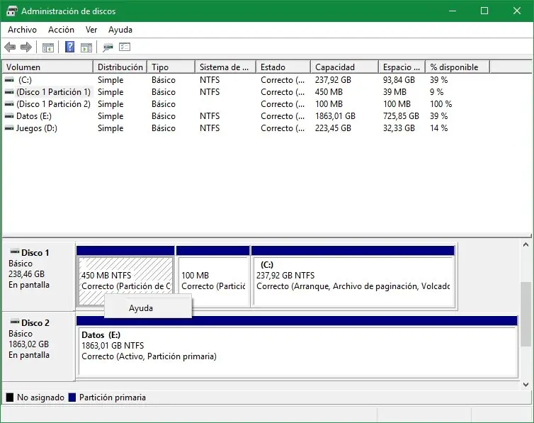 La première chose qui peut nous arriver est d’aller dans le gestionnaire de disque, de localiser le lecteur et de supprimer sa lettre . Cependant, lorsque nous avons fait un clic droit dessus, nous avons probablement constaté que le même menu contextuel n’apparaît pas comme dans d’autres partitions, comme si nous n’avions pas les autorisations pour effectuer cette tâche.