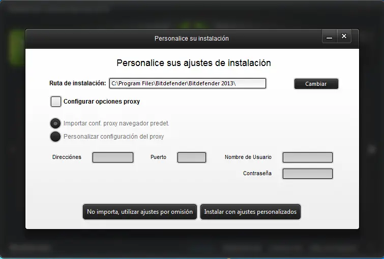 Nous cliquons sur «installer» et il nous demandera le chemin où nous voulons installer Bitdefender et les options de proxy (si nous l’utilisons).