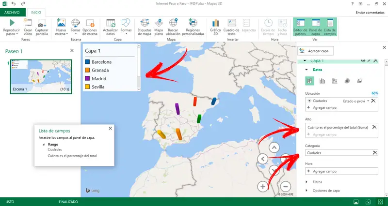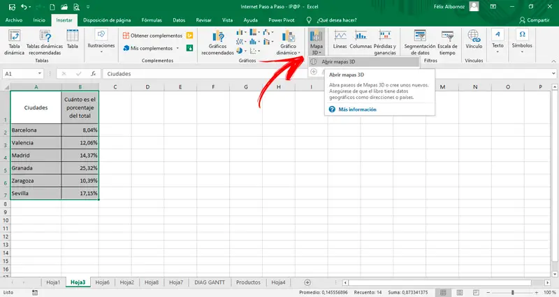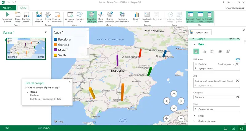 L’outil principal dont vous disposez pour créer ce type de cartes s’appelle «Cartes 3D» . Cette fonction vous permet d’ ajouter des données à une carte avec effet 3D , ce peut utiliser une cartographie d’ Excel pour inclure des éléments que vous avez dans une feuille de calcul.