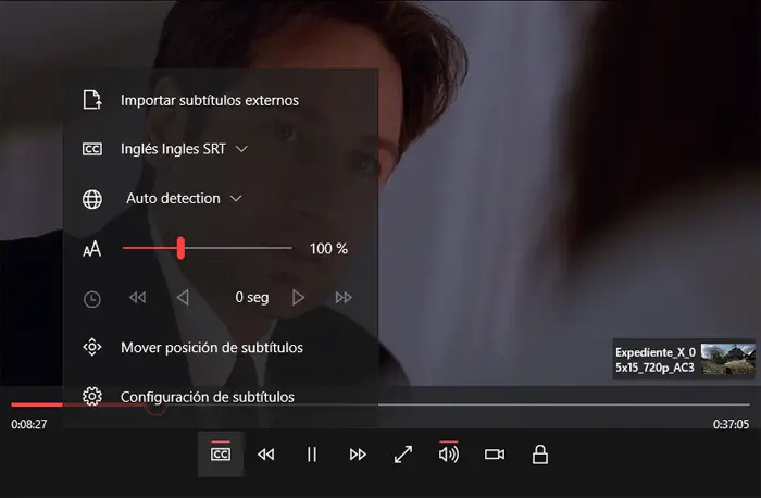 Il s’agit d’un programme qui possède les commandes de lecture habituelles et si nous devons ajouter des sous-titres à la vidéo , il suffit de cliquer sur la première icône à gauche pendant la lecture en tant que telle, et de cliquer sur « Importer des sous-titres externes » pour sélectionner un fichier que nous ont enregistré, en plus de pouvoir configurer d’ autres paramètres liés à cet élément.