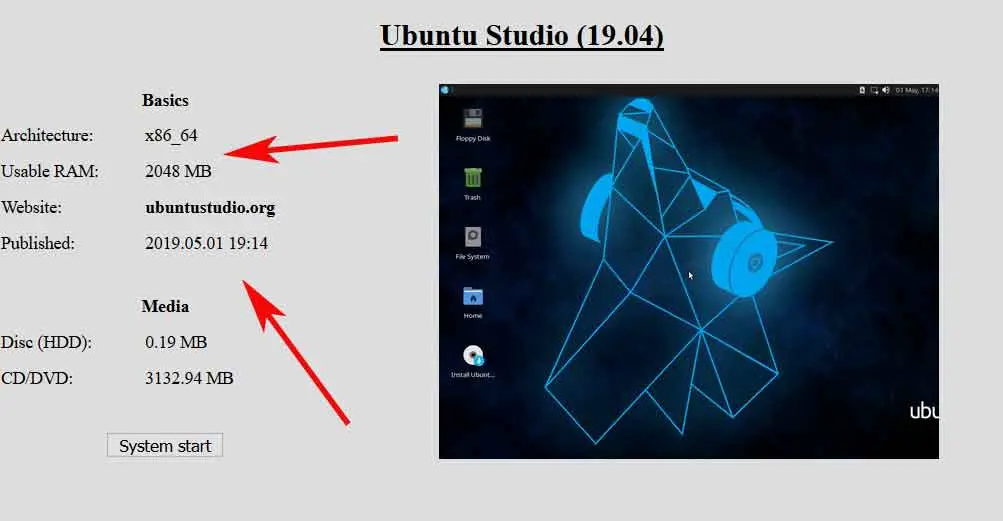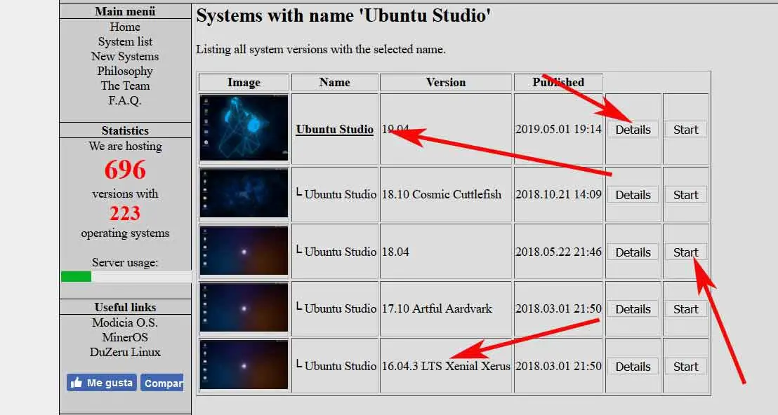Ce sera alors quand une nouvelle fenêtre s’ouvrira dans le navigateur lui-même dans laquelle apparaîtront les différentes versions disponibles sur cette plateforme de la même distribution dans laquelle nous avons cliqué auparavant. En même temps, à côté de chacun d’eux, nous trouvons deux boutons, «Détails» et «Démarrer». Le premier nous montre les détails liés à l’option choisie comme la RAM qu’elle utilise, l’ architecture nécessaire pour qu’elle fonctionne correctement, la date de publication, ou l’ espace disque qu’elle occupe.