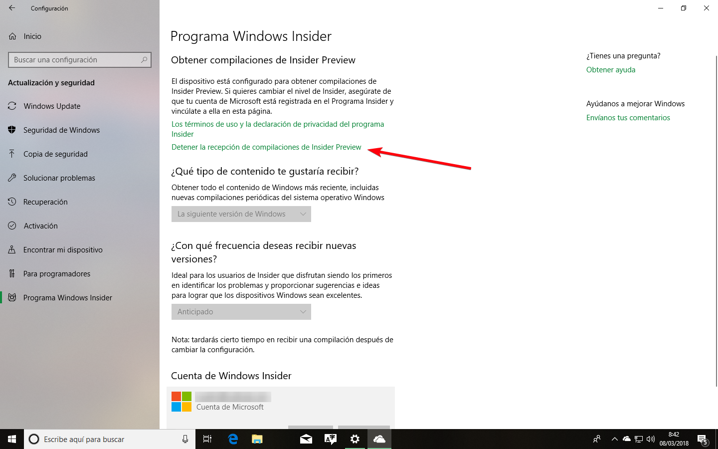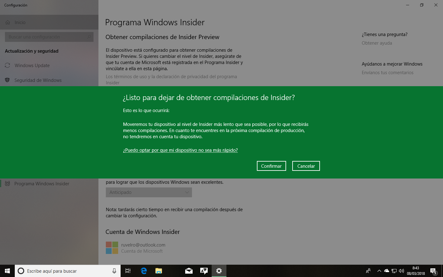 Tout ce qui concerne ces versions Insider de Windows 10 se trouve dans la section « Programme Windows Insider », dans le menu des paramètres, sous « Mise à jour et sécurité ». Les utilisateurs inscrits à ce programme pourront configurer le type de mises à jour qu’ils souhaitent à partir d’ici (rapides et moins stables ou lents et plus stables), en plus, comme le montre l’image suivante, abandonner les compilations d’aperçu.