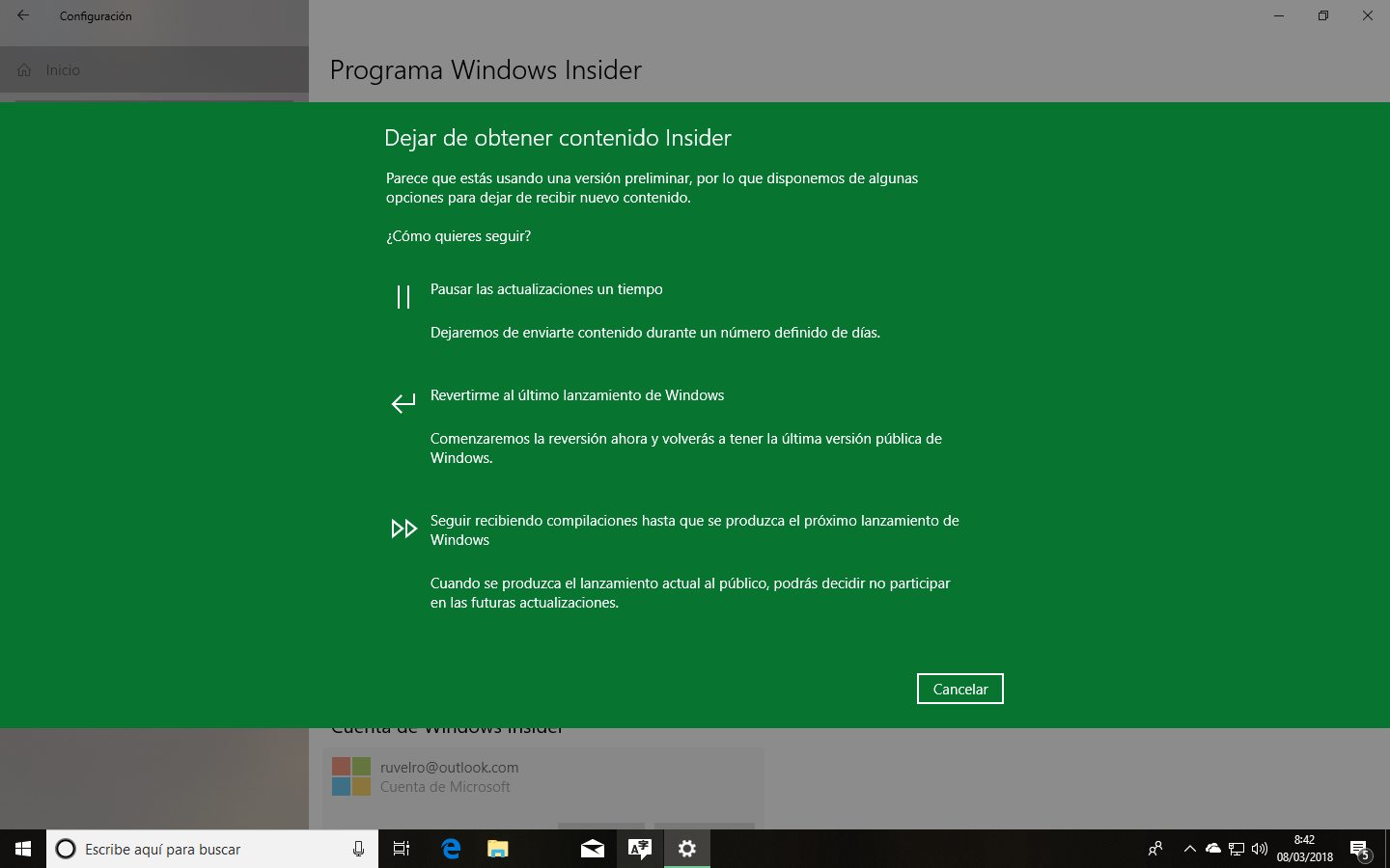 Pour abandonner ce programme, nous cliquons sur « Ne plus recevoir les builds Insider Preview » et nous verrons une nouvelle fenêtre comme celle ci-dessous dans laquelle Windows 10 nous demandera ce que nous voulons faire: