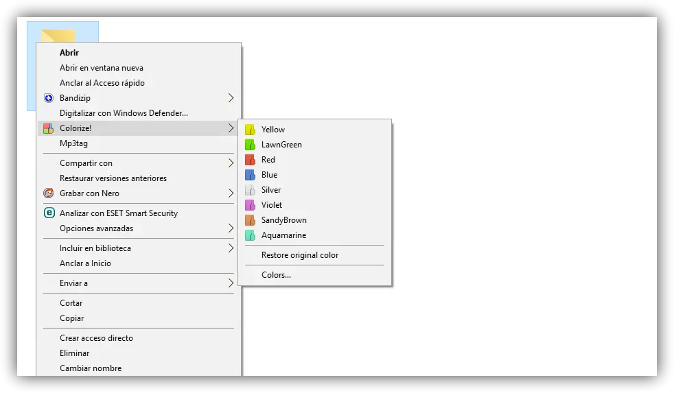 La façon d’utiliser Folder Colorizer est très simple. Tout ce que nous avons à faire est de faire un clic droit sur un dossier de notre système et un nouveau menu apparaîtra appelé « Coloriser! «. Si nous le sélectionnons, nous verrons les différentes couleurs que l’application nous permet de configurer.