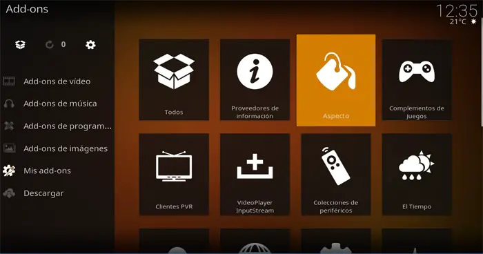 Par conséquent, dans ces lignes, nous allons vous montrer comment activer certains des modules complémentaires spécialement conçus pour ces tâches de personnalisation, le tout à partir du programme multimédia lui-même . Une fois Kodi démarré, dans la partie gauche de la fenêtre, cliquez sur l’option « Modules complémentaires » pour accéder à la section de sélection de ceux-ci, puis cliquez sur le bouton « Apparence ».