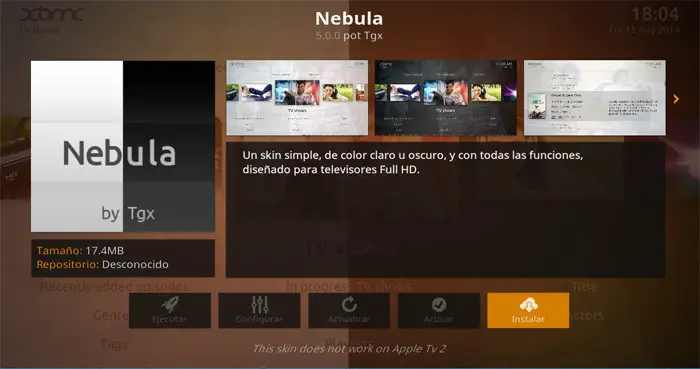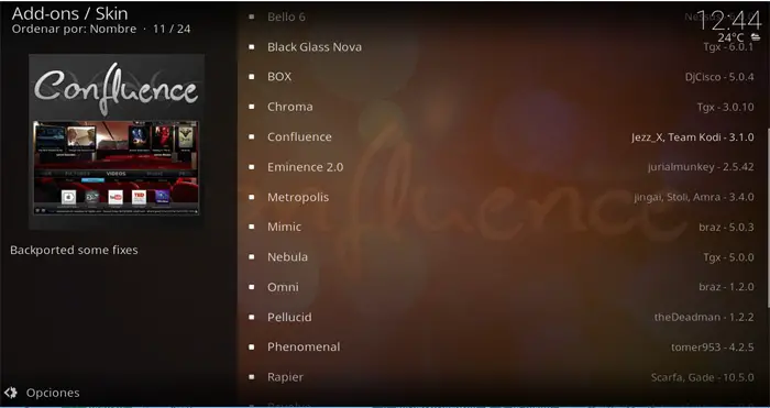 Ensuite, sur l’écran plus de 20 alternatives apparaîtront sous la forme d’add-ons que nous pouvons télécharger et installer et qui font référence à différents «skins» ou skins qui modifieront considérablement l’ apparence de Kodi et pourront ainsi choisir celui que nous comme le plus dans chaque cas. Mais avant de choisir l’une des alternatives répertoriées, nous pouvons voir des exemples d’images pour nous donner une idée de ce à quoi ressemble chaque module complémentaire. Pour cela, il suffit de cliquer sur chacun d’eux et, en haut de l’ écran , nous verrons les exemples de captures; une fois que nous nous sommes décidés, cliquez sur le bouton » Installer » dans le coin inférieur droit de cette fenêtre.