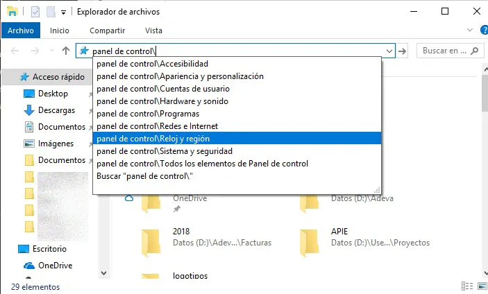En outre, il est également possible de naviguer dans les options du panneau à partir de l’explorateur de fichiers Windows si nous cliquons directement sur la barre d’adresse de l’explorateur et tapez Panneau de configuration et toutes les options seront affichées au fur et à mesure de la saisie.