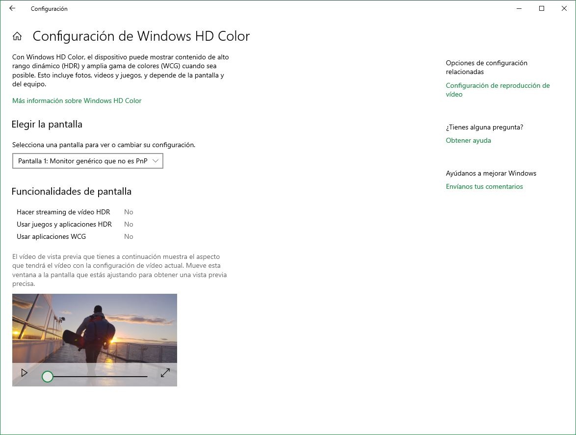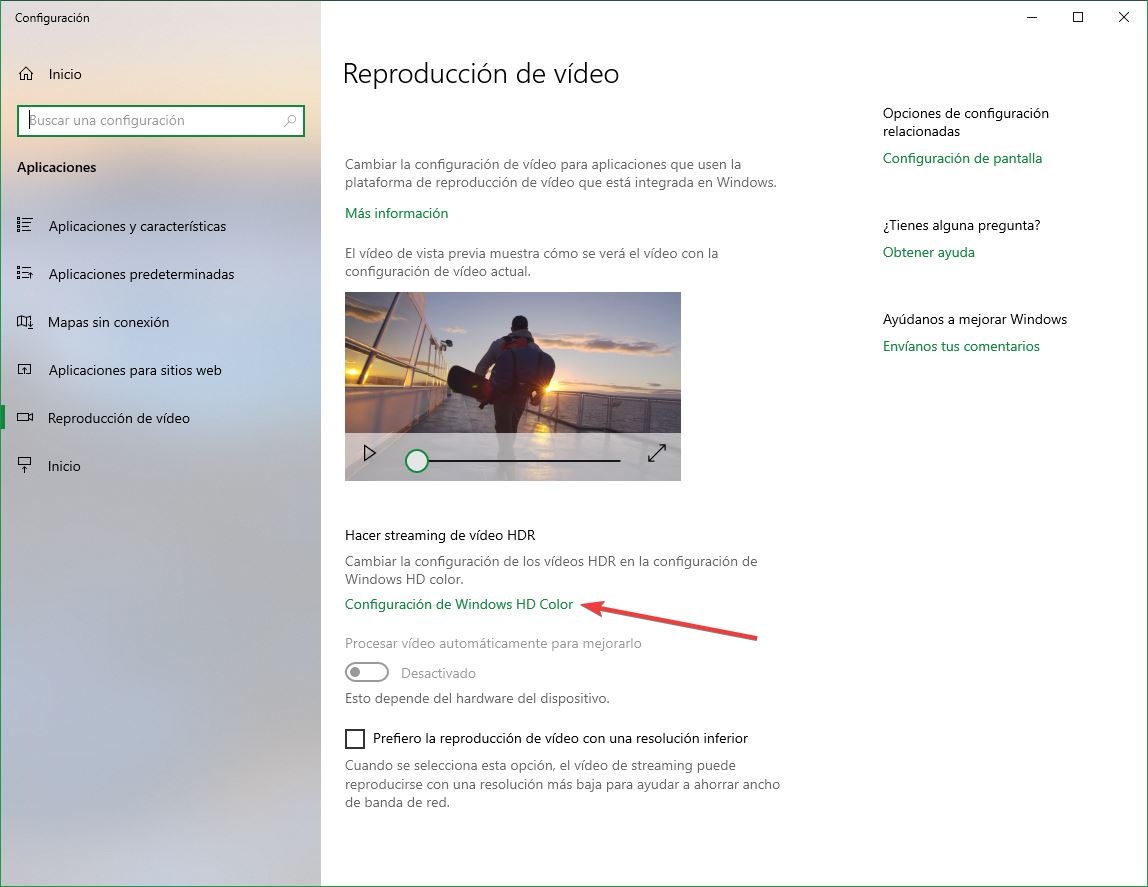 Dans cette section, nous pourrons voir un exemple de vidéo (utile pour comparer son apparence avec HDR et sans HDR) et nous verrons un bouton qui nous mènera à la configuration Windows HD Color.