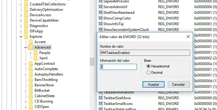 Depuis le registre Windows, nous pouvons également masquer la barre des tâches sur plusieurs écrans. Pour ce faire, nous ouvrons le registre et naviguons vers le chemin HKEY_CURRENT_USERSOFTWAREMicrosoftWindowsCurrentVersionExplorerAdvanced . Une fois là-bas, nous faisons un clic droit sur le panneau de droite et sélectionnons l’option Nouveau> Valeur DWORD 32 bits et lui donnons le nom MMTaskbarEnabled .