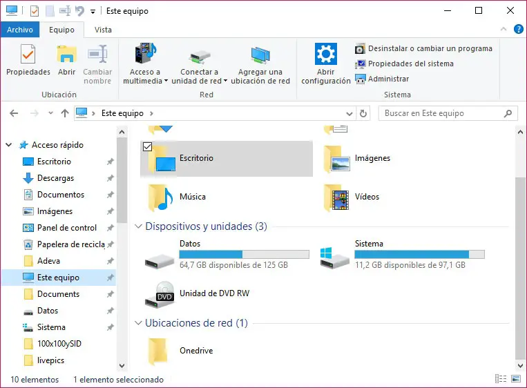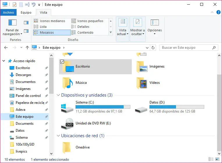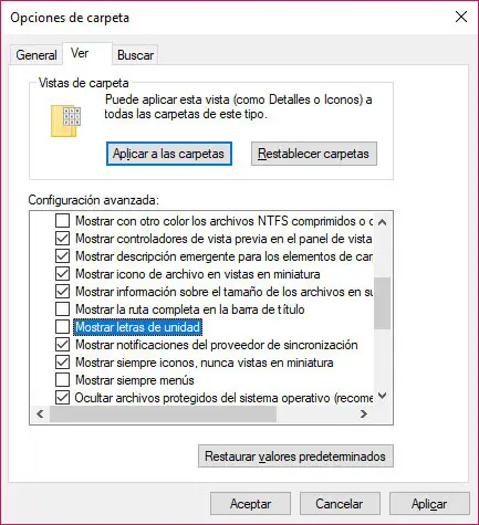 Une fois que nous avons trouvé cette option, nous décochons la case, cliquez sur Appliquer pour enregistrer les modifications et sur OK pour fermer. Maintenant, nous pouvons revenir à l’explorateur de fichiers Windows et vérifier comment les lettres des lecteurs système ne sont plus affichées et que seul le nom de chacun apparaît.