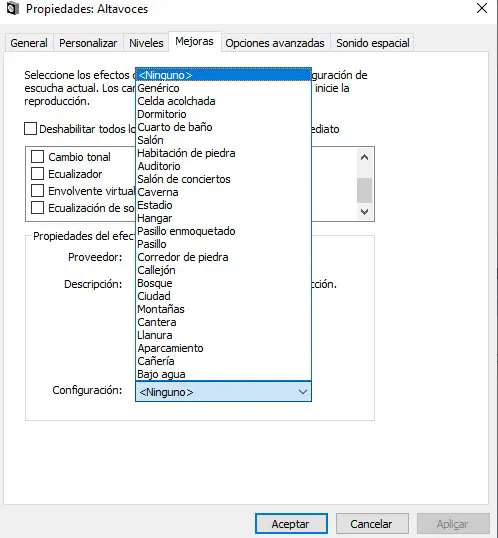 Ensuite, dans la liste déroulante, choisissez l’option «Sons» puis nous avons choisi l’onglet «Lecture» où se trouve le système audio affiché que vous avez installé, sur lequel nous cliquons puis sélectionnez le bouton «Propriétés». Eh bien, une fois ici, si nous allons dans l’ onglet appelé «Améliorations», nous trouvons diverses sections comme la possibilité de choisir entre l’un des profils sonores par défaut que le système lui-même présente.