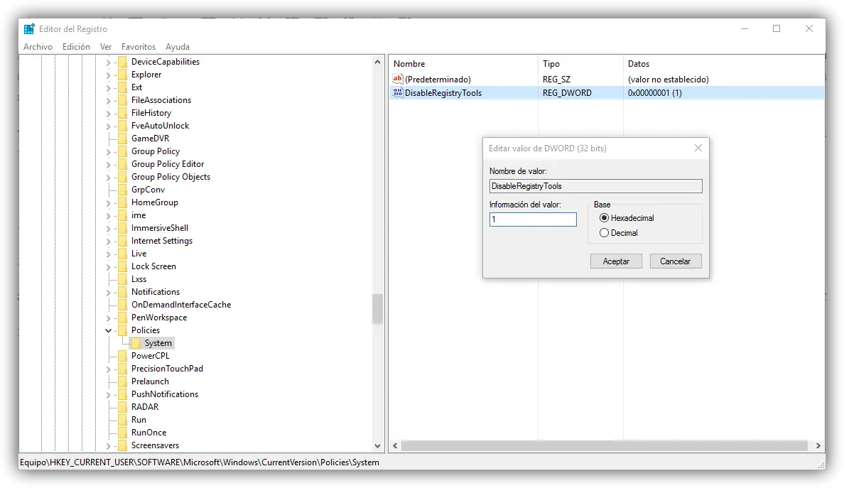 Une fois dedans, nous créons une nouvelle valeur DWORD 32 bits appelée DisableRegistryTools et, en double-cliquant dessus, nous lui attribuons la valeur «1» pour activer ladite clé.