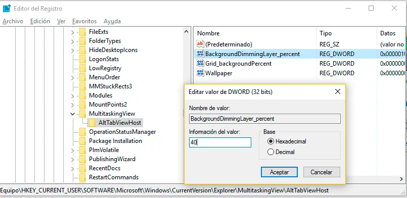 Par conséquent, si nous voulons changer le niveau de luminosité de l’ écran qui nous montre les applications ouvertes en arrière – plan lorsque vous appuyez sur Alt + TAB, nous devrons modifier une valeur dans le registre du système. Comme toujours lorsque nous allons apporter des modifications au registre, nous vous recommandons de faire une copie de sauvegarde au préalable. Une fois que cela est fait, nous allons au chemin HKEY_CURRENT_USERSOFTWAREMicrosoftWindowsCurrentVersionExplorerMultitaskingViewAltTabViewHost . Il faut y trouver plusieurs valeurs DWORD parmi lesquelles on en trouvera une avec le nom BackgroundDimmingLayer_percent , qui est celle qui nous intéresse dans ce cas.