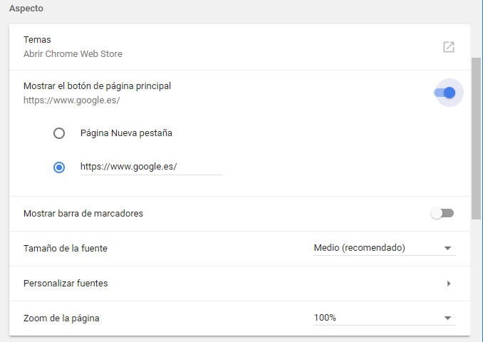 La première chose à faire est d’ouvrir une fenêtre Google Chrome et de cliquer sur le bouton de menu pour accéder aux paramètres . Une fois là-bas, si nous descendons dans la section Apparence , nous trouverons la possibilité d’afficher le bouton de la page principale ou la page d’accueil, que nous pouvons activer ou désactiver avec le commutateur qui est affiché juste à côté. Si nous le mettons en position OFF, nous verrons comment le bouton de démarrage disparaît automatiquement du navigateur.