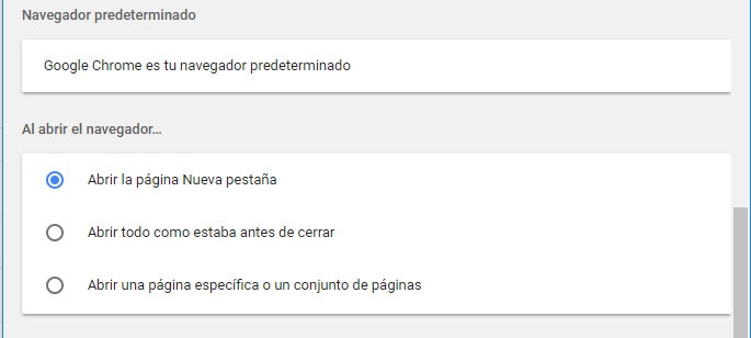 De plus, si on descend un peu plus bas se trouve la section Quand on ouvre le navigateur… , on va également pouvoir établir d’autres paramètres sur le comportement de Google Chrome au moment de son ouverture. Parmi eux, nous pouvons choisir si, lorsque nous ouvrons le navigateur, nous voulons ouvrir la nouvelle page à onglet, tout ouvrir tel qu’il était avant sa dernière fermeture, ou ouvrir une page ou un ensemble de pages spécifique.