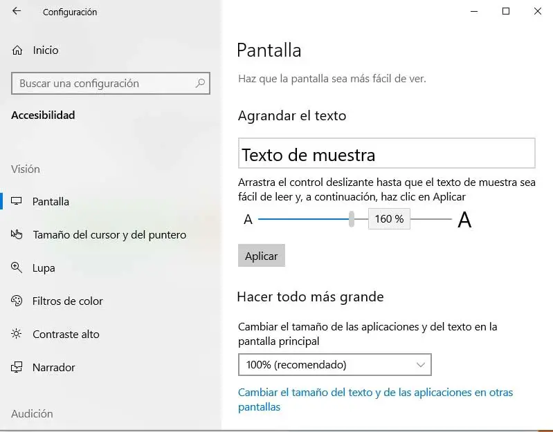 Si la taille de la police dans Windows 10 semble encore petite ou au contraire, nous pensons être allés trop loin et voulons la réduire un peu, il suffit de retourner à la page des paramètres> accessibilité> écran et faire glisser le contrôle qui nous permet de changer la taille de la lettre jusqu’à ce que nous puissions établir la taille qui correspond le mieux à nos besoins.