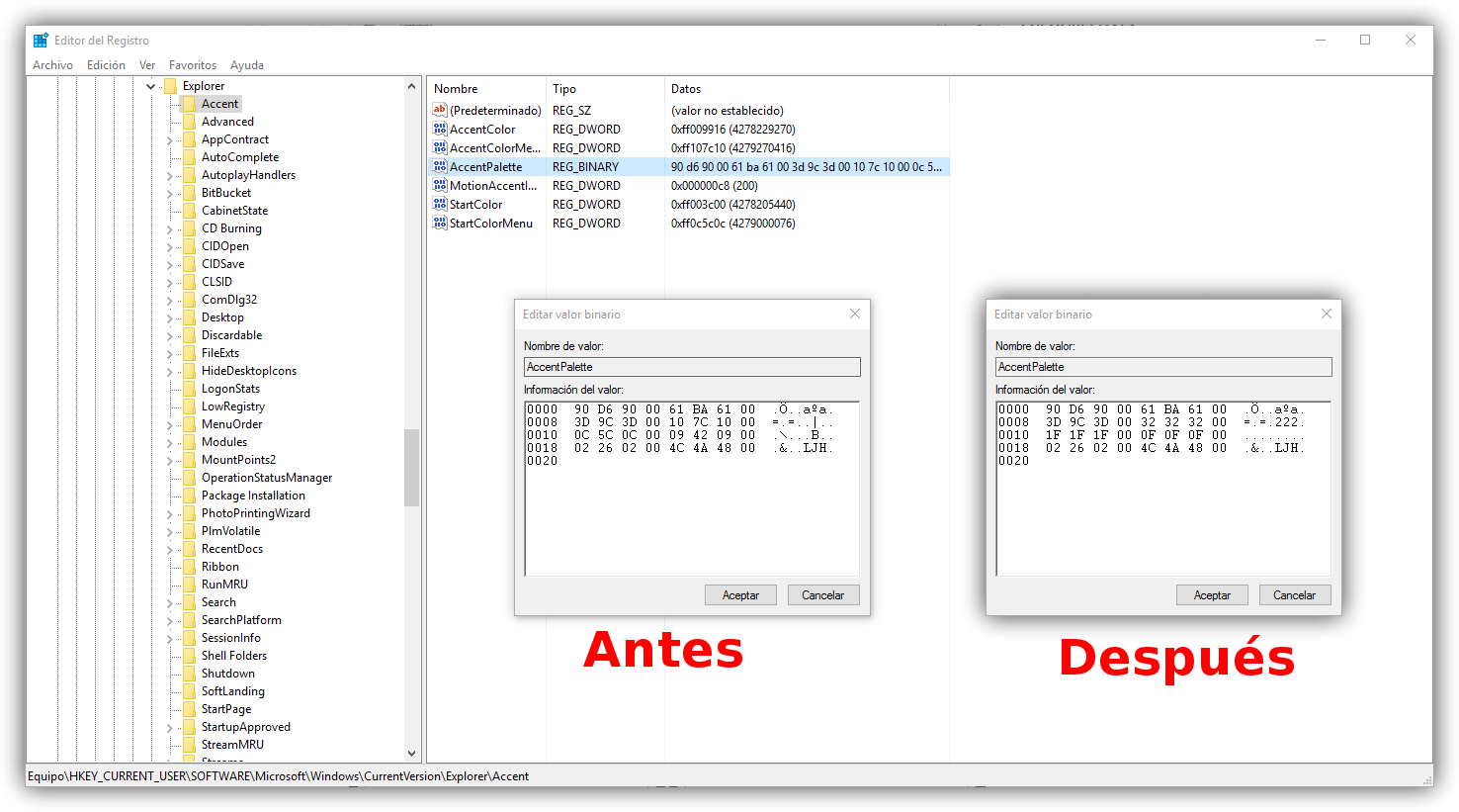 Là, nous verrons une entrée appelée AccentPalette . Nous le modifions avec un double clic et modifions sa valeur comme indiqué dans l’image ci-dessous: