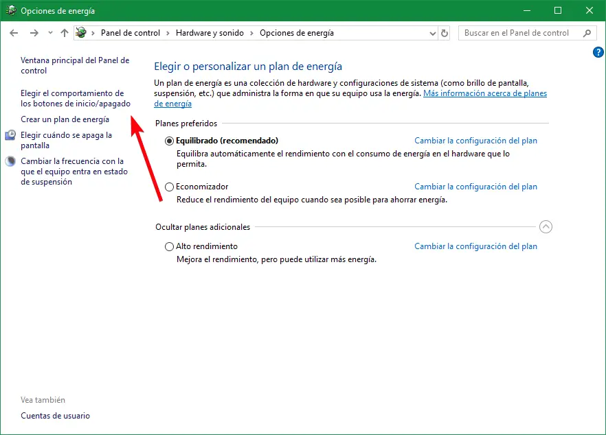 Pour accéder à cette configuration, la première chose à faire est de se rendre dans les options d’alimentation de l’équipement. Pour ce faire, il suffit d’ouvrir le panneau de configuration de Windows et, à partir de celui-ci, d’accéder à la section Matériel et audio> Options d’alimentation> Paramètres système .