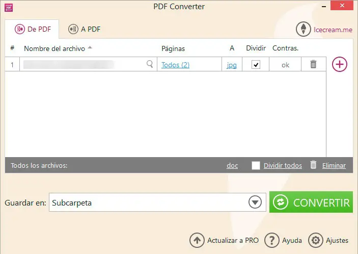 Ensuite, nous pouvons également choisir si nous voulons diviser le fichier PDF en différentes images, une pour chaque page, choisir le chemin où nous voulons les enregistrer et cliquer sur le bouton Convertir . Téléchargez Icrecream PDF Converter à partir de ce lien.