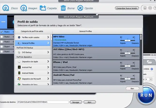 Automatiquement, WinX DVD Ripper Platinum reconnaîtra notre DVD et une fenêtre nous sera affichée afin que nous puissions choisir le profil ou le format de sortie . Là, nous pouvons indiquer si nous voulons générer une vidéo au format MP4, AVI, WM, MPEG ou valide pour iPhone ou Android.