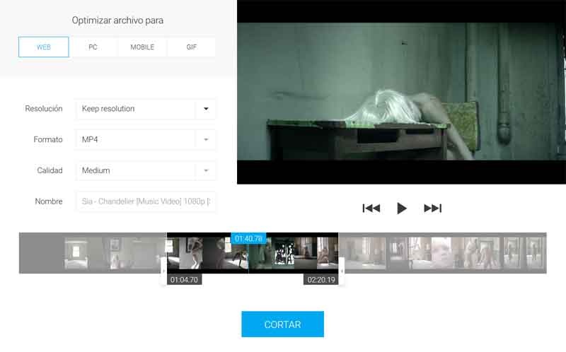 Une fois téléchargé sur la plateforme, ce qui prendra quelques secondes en fonction de la taille du fichier, nous avons une nouvelle interface sous la forme d’un lecteur multimédia dans lequel nous pouvons voir le contenu chargé dans son intégralité. Ainsi, pour sélectionner la partie de celui-ci que nous sommes vraiment intéressés à extraire, dans la timeline située en bas de l’interface, nous pouvons voir deux curseurs qui agissent comme des délimiteurs, à la fois de début et de fin, pour marquer cet abstrait.