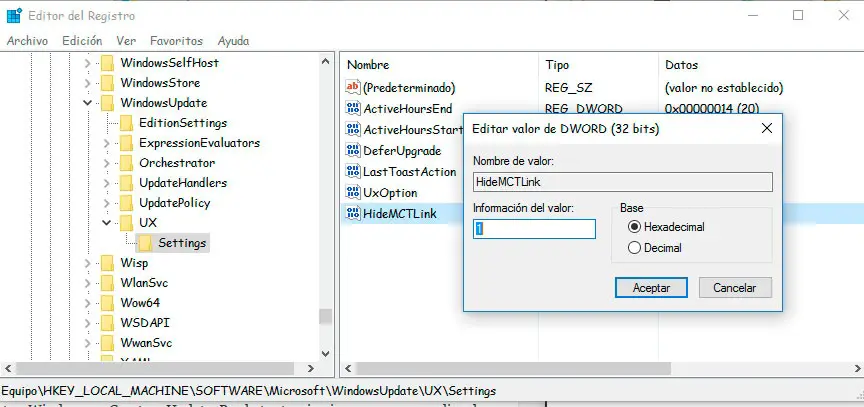 Pour ce faire, nous devrons accéder au registre de Windows 10, en exécutant la commande regedit depuis la fenêtre Exécuter de Widnows puis aller sur le chemin HKEY_LOCAL_MACHINESOFTWAREMicrosoftWindowsUpdateUXSettings . Une fois là-bas, sur le panneau de droite, nous cliquons avec le bouton droit de la souris et sélectionnons Nouveau> Valeur DWORD 32 bits et lui donnons le nom de HideMCTLink .