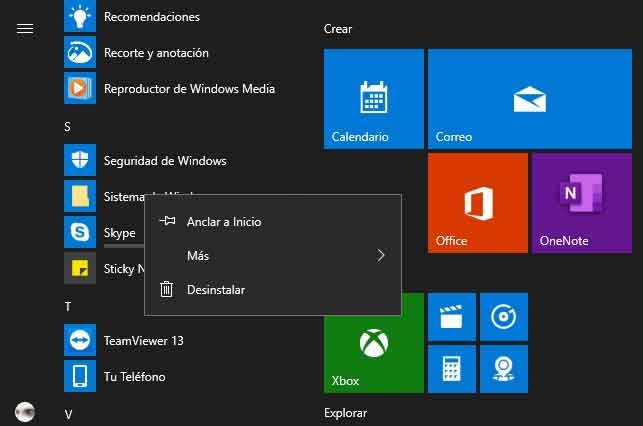 Par conséquent, dans le cas où nous ne voulons pas que ce logiciel reste inutilement installé dans le système, nous pouvons accéder au menu Démarrer de Windows 10 et rechercher Skype parmi la liste des applications qui apparaîtra ici. Donc, nous allons le déplacer jusqu’à ce que nous trouvions Skype, bien que ce soit quelque chose qui peut également être fait en utilisant la fonction de recherche de Windows . Une fois que nous l’avons trouvé, nous n’aurons plus qu’à cliquer avec le bouton droit de la souris dessus et, dans le menu contextuel qui apparaît, nous verrons une option de désinstallation, où nous cliquons pour son élimination.