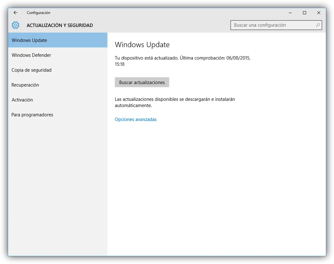 Parmi les entrées qui apparaissent, nous devons choisir la «Configuration de Windows Update». Une fenêtre récapitulative apparaîtra avec la dernière fois que les mises à jour ont été installées et en bas un lien vers les «options avancées».