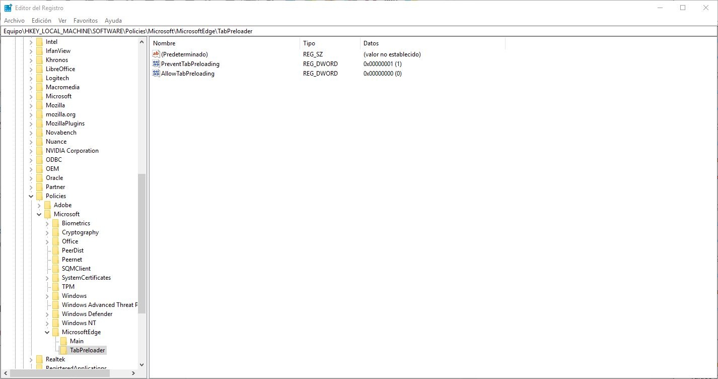 - HKEY_LOCAL_MACHINESOFTWAREPoliciesMicrosoftMicrosoftEdgeTabPreloader