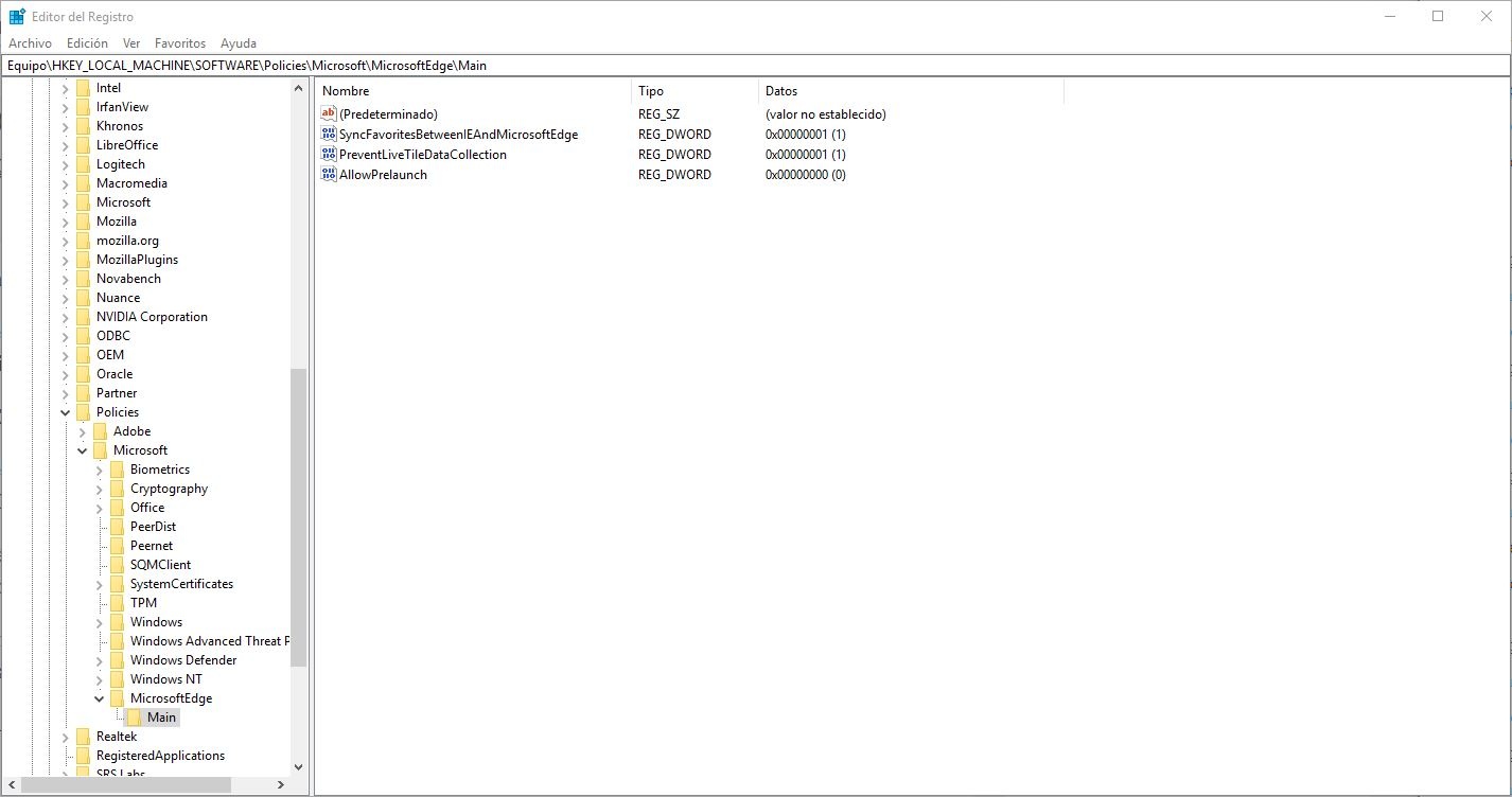 - OrdinateurHKEY_LOCAL_MACHINESOFTWAREPoliciesMicrosoftMicrosoftEdgeMain