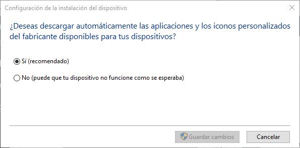 Dans cette section, nous pourrons choisir si nous voulons que Windows télécharge et installe automatiquement des applications et des icônes personnalisées pour les appareils que nous connectons. Cliquez sur ce bouton pour ouvrir une nouvelle fenêtre avec deux options. La première option, » Oui «, recommandée et activée par défaut est celle qui téléchargera et installera ces applications sans autorisation, tandis que la deuxième option, » Non «, sera celle qui empêchera que cela se produise.