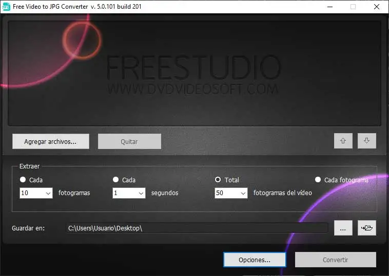 Cet outil auquel nous faisons référence s’appelle Free Video to JPG Converter , qui, comme son nom l’indique, vous permet de capturer une image spécifique d’une vidéo pour l’enregistrer sous forme d’image au format JPG. De plus, c’est une application que nous pouvons obtenir gratuitement à partir de ce même lien vers le site officiel du développeur.