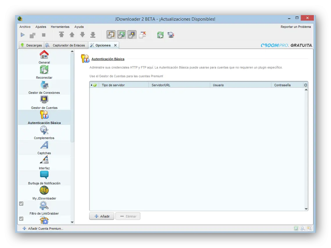 D’autres sections importantes de l’application sont le gestionnaire de compte, où nous entrerons les informations d’identification de nos comptes utilisateurs sur les différents serveurs pour démarrer les téléchargements.