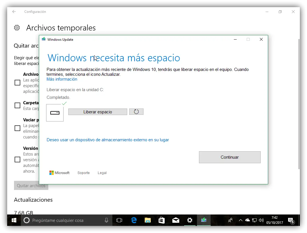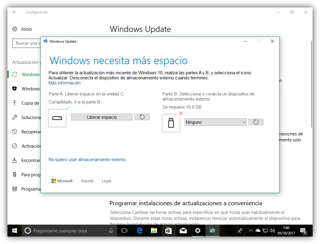 Windows 10 nous offrira plusieurs options pour mettre à jour Windows 10 si nous n’avons pas d’espace