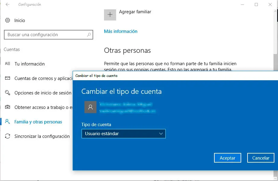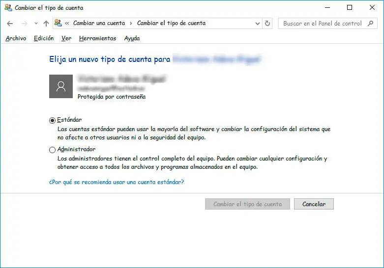 Ensuite, une fenêtre s’ouvrira indiquant le compte dont nous voulons changer le type et une liste déroulante où nous pouvons choisir si nous voulons que ce compte devienne administrateur ou standard . Nous choisissons l’option correspondante et cliquons sur le bouton Accepter pour que les modifications soient appliquées.