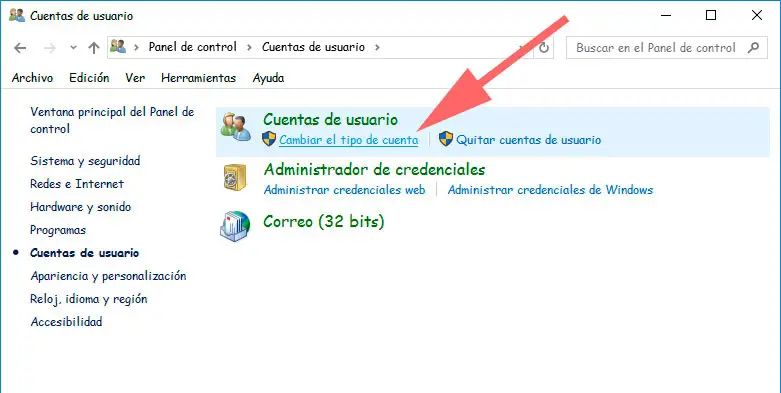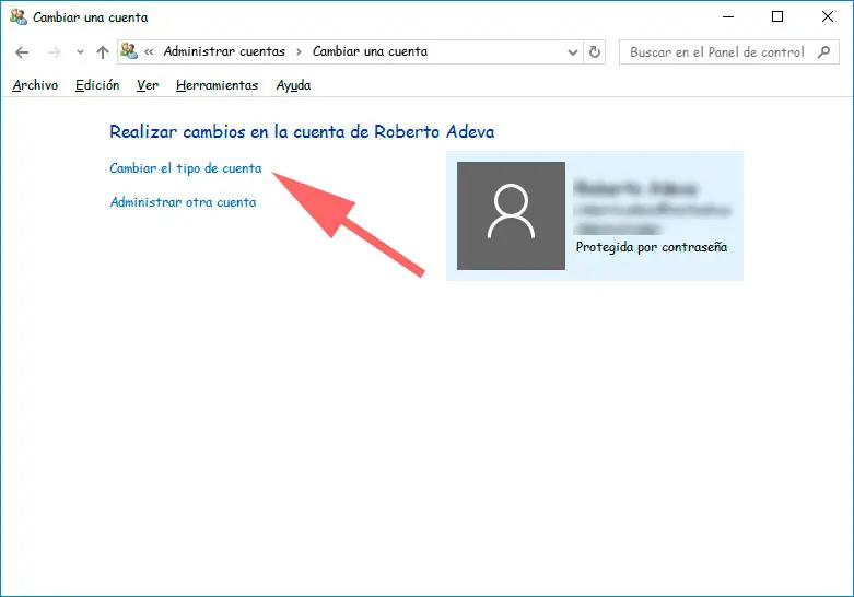 Depuis le panneau de configuration de Windows 10, nous pouvons également modifier le type de compte d’un utilisateur. Pour ce faire, nous ouvrons le Panneau de configuration> Comptes d’utilisateurs> Changer le type de compte . Une fois sur place, nous choisissons le compte que nous souhaitons modifier, cliquez sur l’option Modifier le type de compte et choisissez l’option.
