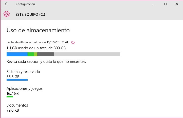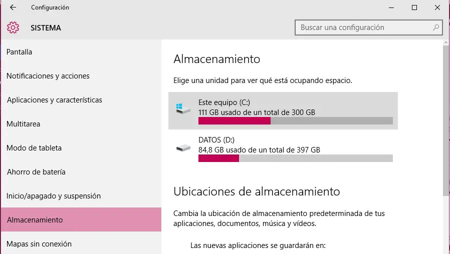 Par conséquent, la première chose à faire est d’aller dans la configuration du système à partir du menu Démarrer, puis de sélectionner l’option Système . Une fois là-bas, nous choisissons l’option de stockage dans le menu de gauche, puis nous sélectionnons le lecteur à partir duquel nous voulons supprimer les fichiers temporaires. Cela nous montrera des informations sur l’utilisation de notre stockage et la quantité d’espace utilisé par le système, les applications, les jeux, les documents, les images, les fichiers temporaires, etc.