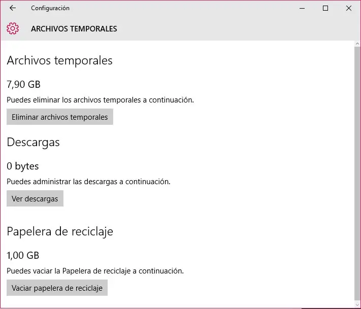 On fait défiler vers le bas, on clique sur l’option Fichiers temporaires et on peut voir l’espace occupé sur notre disque par ce type de fichiers, gérer les téléchargements ou même voir la quantité d’espace que l’on peut aussi récupérer en vidant la corbeille.