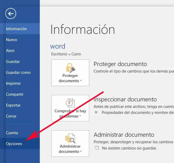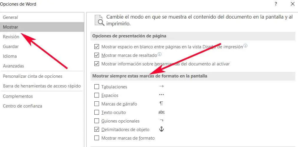 Eh bien, afin de personnaliser ce que nous voulons afficher à l’écran à cet égard à partir de maintenant, la première chose que nous allons faire est d’aller dans le menu «Fichier» dans Word, et dans la liste qui apparaît, nous choisissons «Options ». Une fois dans la nouvelle fenêtre qui apparaît, cliquez sur «Afficher», où la section que nous recherchons apparaîtra dans ce cas «Toujours afficher ces marques de format à l’écran».