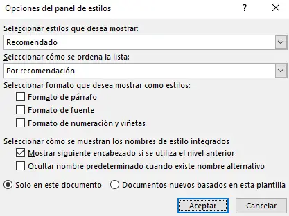 Una vez que aparece la nueva ventana de opciones del panel de estilos , ya podemos abrir el menú desplegable «Seleccionar estilos que desea mostrar», para cambiar los disponibles desde «Recomendado» a «Todos los estilos» y, a continuación, pulsamos en « Accepter».