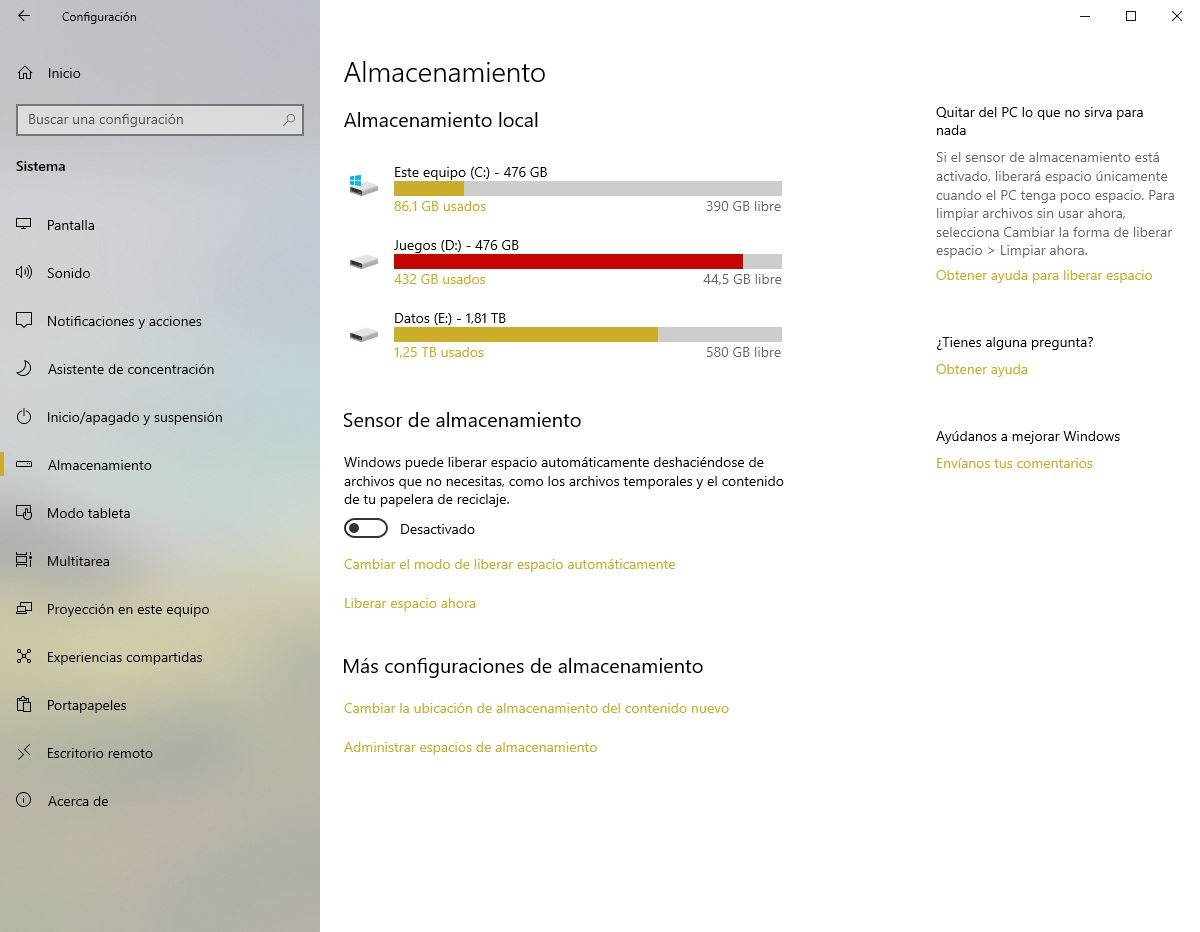 Nous devons également profiter et nettoyer le disque dur en utilisant, par exemple, le capteur de stockage Windows 10. Les mises à jour Windows nécessitent généralement entre 30 et 50 Go d’espace pour pouvoir s’installer sans problème, nous devons donc nous assurer que nous avons dit espace disponible sur l’ordinateur avant de commencer le téléchargement de la mise à jour Windows 10 mai 2019.