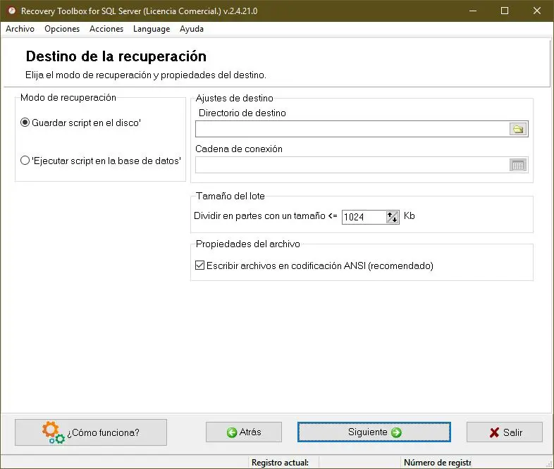 Si tout est correct, nous continuerons avec l’assistant puis nous configurerons la destination de la récupération de données. Nous choisirons où nous voulons sauvegarder la base de données récupérée et cliquerons sur «Suivant» pour revoir un résumé et nous assurer que tout est correct.