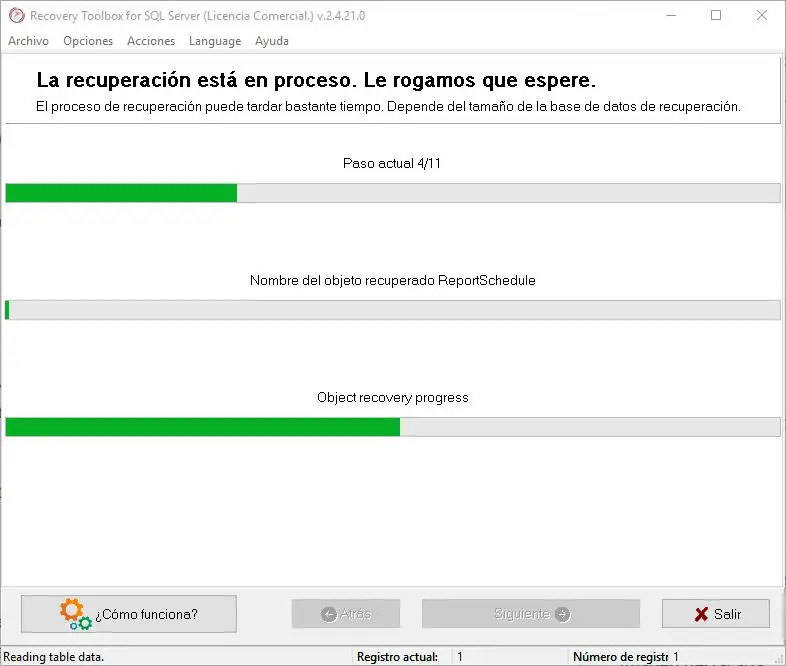 Nous devons attendre plusieurs minutes pendant que Recovery Toolbox for SQL Server effectue ses vérifications et tente de réparer le fichier. Le processus est entièrement automatique, nous n’avons donc rien d’autre à faire que d’attendre.