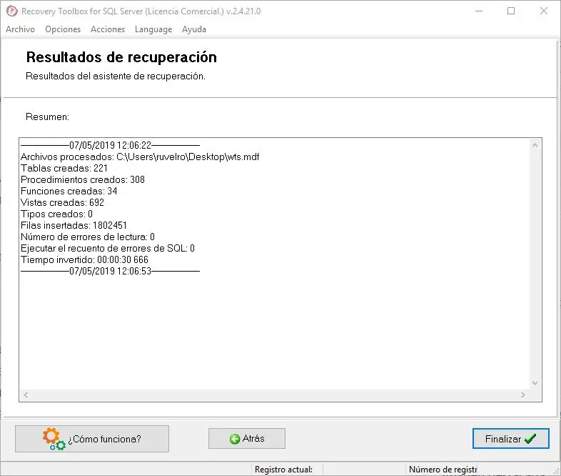 Quand il sera terminé, nous aurons la base de données récupérée et enregistrée dans le chemin que nous avons sélectionné. Nous pouvons voir un résumé du processus de récupération dans la fenêtre finale du programme.