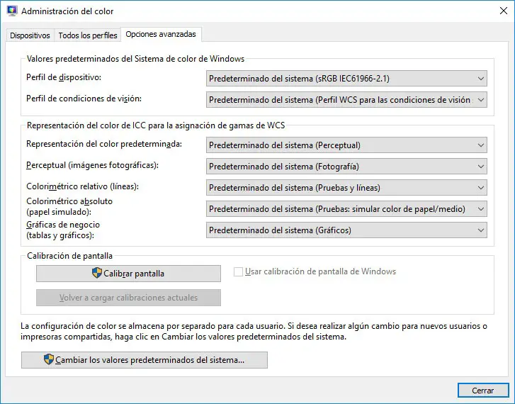 Gardez à l’esprit que les paramètres de couleur sont stockés séparément pour chaque utilisateur dans Windows 10, par conséquent, si nous voulons apporter des modifications pour les nouveaux utilisateurs ou les imprimantes partagées, nous pouvons cliquer sur le bouton Modifier les paramètres par défaut du système qui se trouve au bas de la fenêtre. Enfin, nous pouvons cliquer sur le bouton d’écran Calibrer pour essayer de le calibrer au mieux.