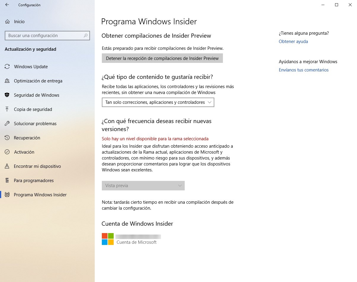 Cliquez sur «Démarrer» et nous devrons compléter un simple assistant de démarrage dans lequel nous devrons choisir un compte Microsoft que nous allons lier au programme Insider, le type de contenu que nous voulons recevoir (nous choisirons la première option, pour vous inscrire uniquement dans la version préliminaire), et nous accepterons les conditions d’utilisation.