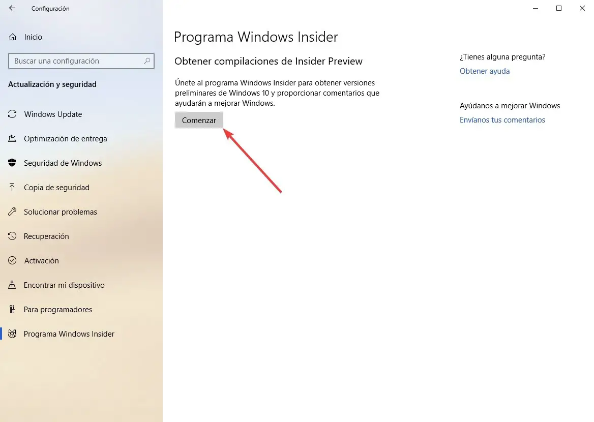 Pour ce faire, nous allons simplement ouvrir le menu Paramètres de Windows 10 et accéder à la section « Mise à jour et sécurité> Programme Windows Insider ». Ici, nous verrons un bouton qui nous permettra de commencer à utiliser ce programme et de recevoir les versions de développement du système et les mises à jour.