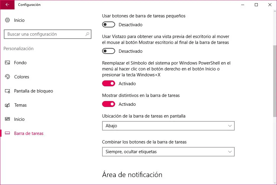 Par conséquent, nous allons montrer comment remplacer ces deux options en ouvrant PowerShell et en ouvrant PowerShell avec des autorisations d’administrateur. Pour ce faire, la première chose que nous devons faire est d’aller dans la configuration du système, choisissez l’option Personnalisation et à l’intérieur, cliquez sur l’option Barre des tâches.
